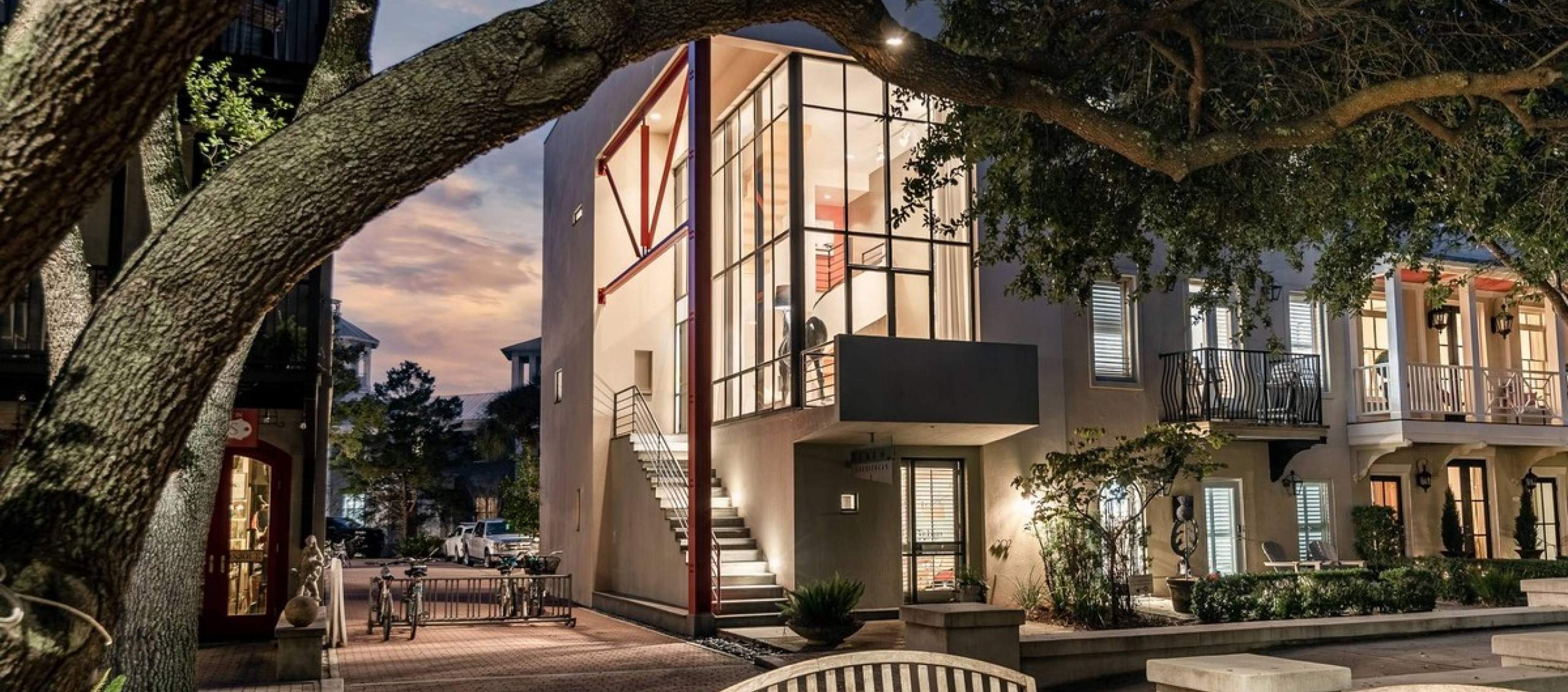 Stairway to Heaven vacation home is a unique icon in Seaside, remarkable even in this town known for its uniqueness. It's an architectural achievement that feels like living inside a work of art, fantastically modern yet immersed in nature, set on the corner of Ruskin Place Park, overlooking and opening out into the shaded tranquility of that lovely park. The setting is right in the heart of Seaside, but cloistered away from the bustle, and above the fray, with its own private driveway.