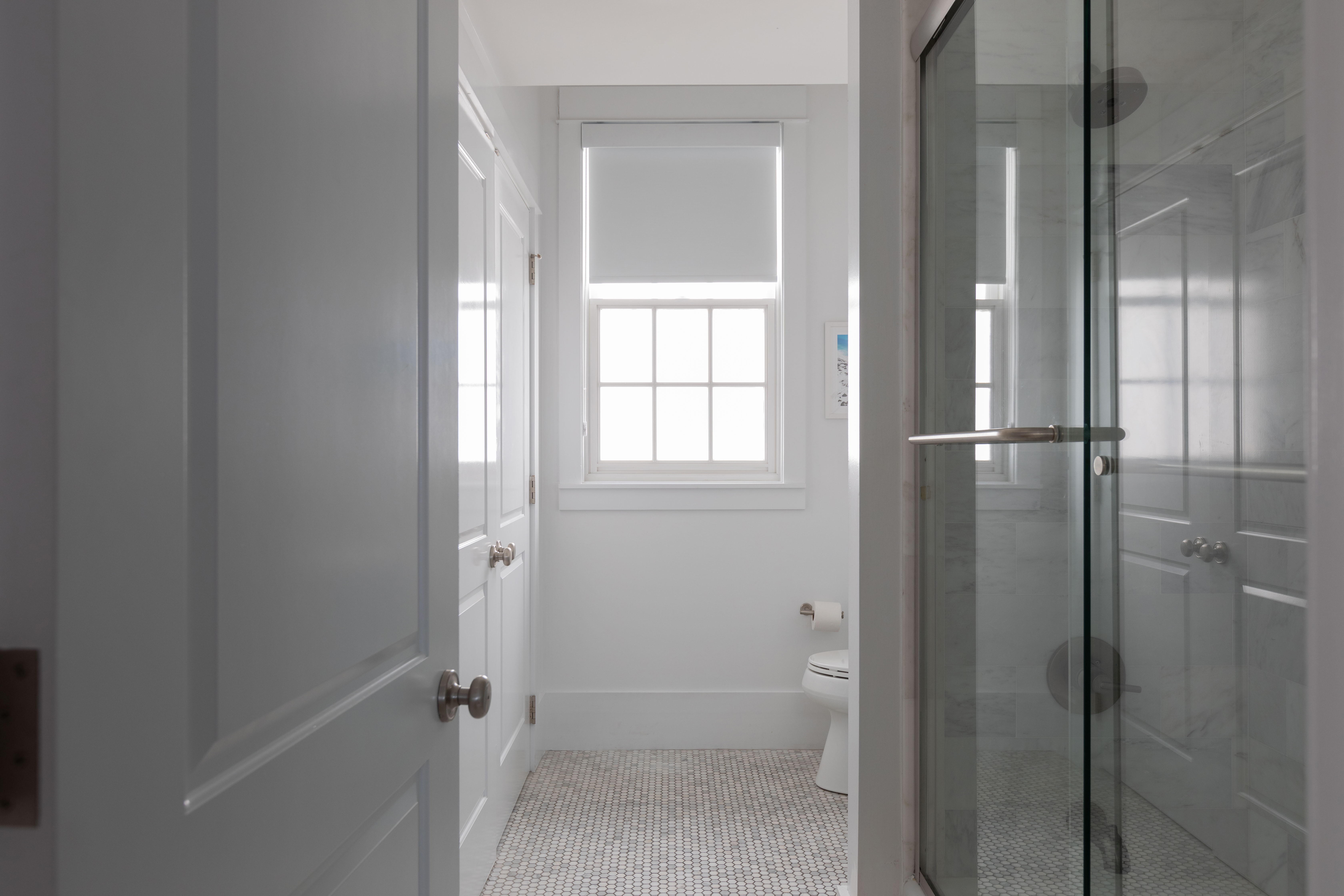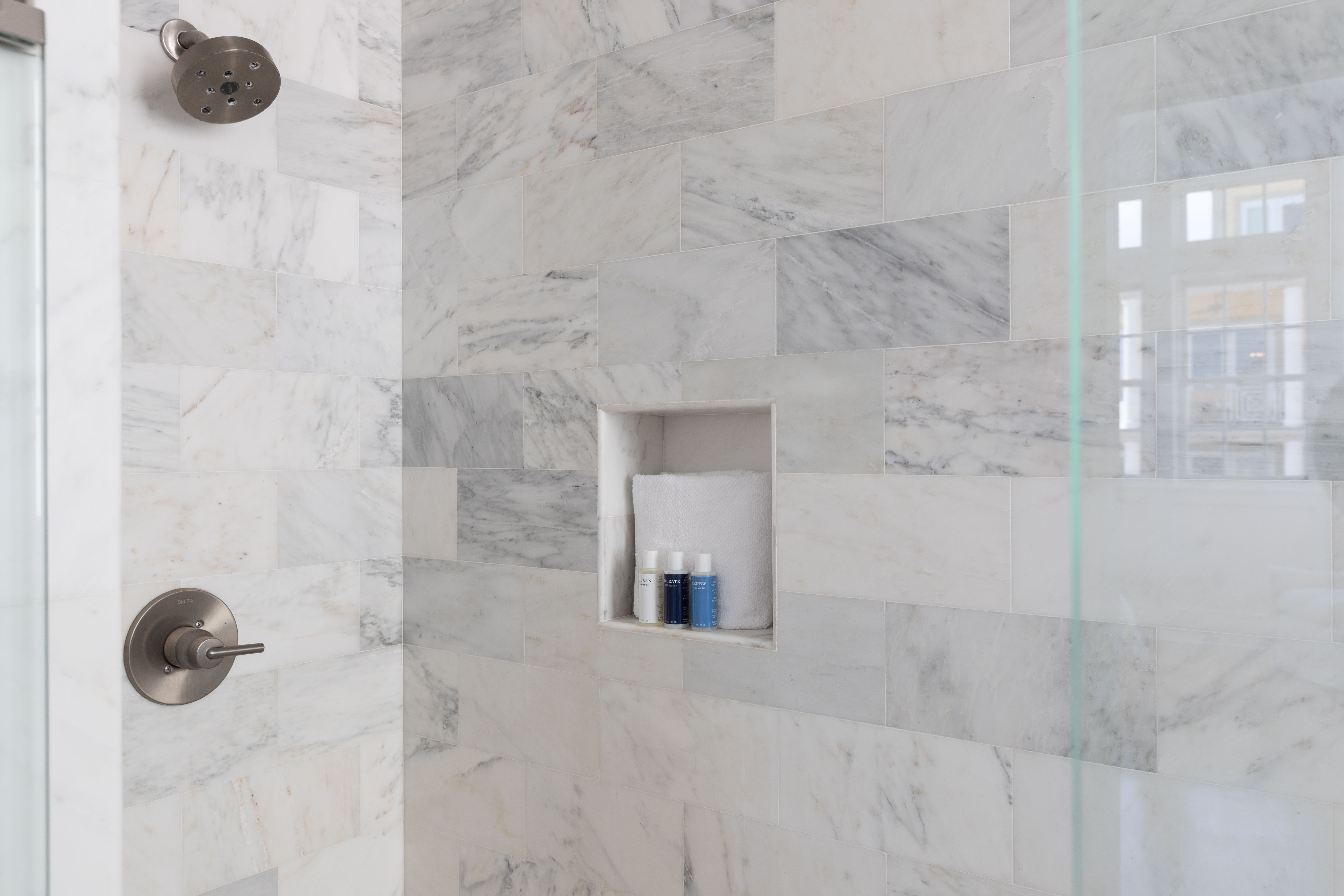 LARGE GLASS ENCLOSED MARBLE SHOWER