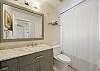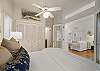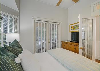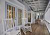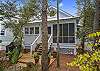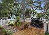 Just off the living area are the two bedrooms. The front bedroom features a king bed with privacy doors a flat screen TV and its own private renovated bathroom with a bath and tub combination with a single vanity.  The second bedroom is a queen at the rear of the home with closets, a flat screen mounted TV, and a renovated bathroom with a single vanity and a tub and shower combination.  The queen bedroom has access to the rear screen in porch with Adirondack seating for two that overlooks an outdoor deck and large fenced in back yard with a gardener’s edible garden.  Off the porch is a wooded deck, a gas grill and an outdoor shower as well as plenty of space to enjoy shade with family and friends. ‘Lady on the Beach’ awaits your arrival!