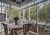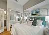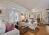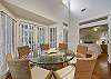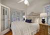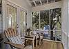 Nearby, an airy, spacious living space provides two comfortable sofas, one serving as a queen sleeper sofa, and a flatscreen TV complete with a Sonos sound bar.  This area is located in between the kitchen and dining space, making it the perfect ‘common ground’ area to commune and gather after a fun-filled day. Next to the living area, guests can find a large dining table for six that opens onto the front screened in porch.
