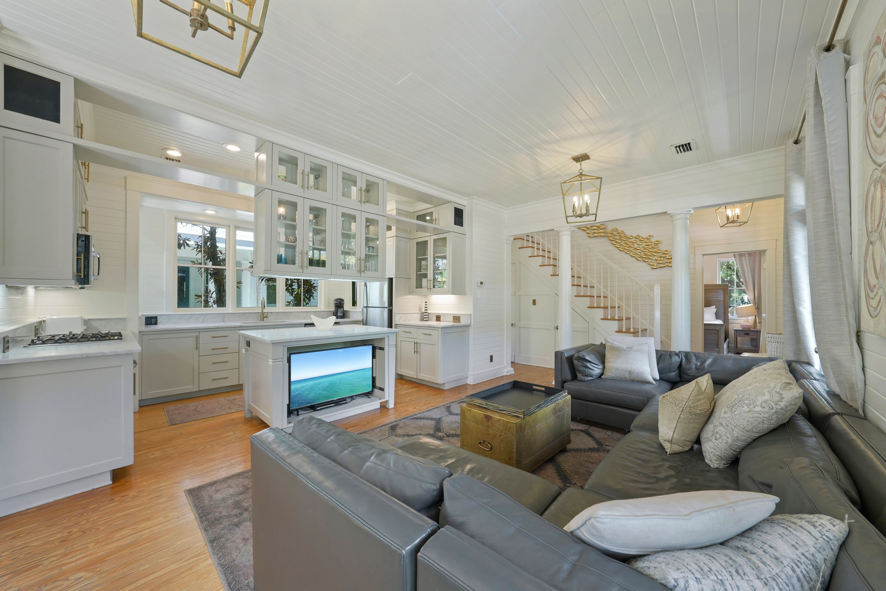 OPEN KITCHEN AND LIVING - SECTIONAL & FLAT SCREEN TV IN CENTER C