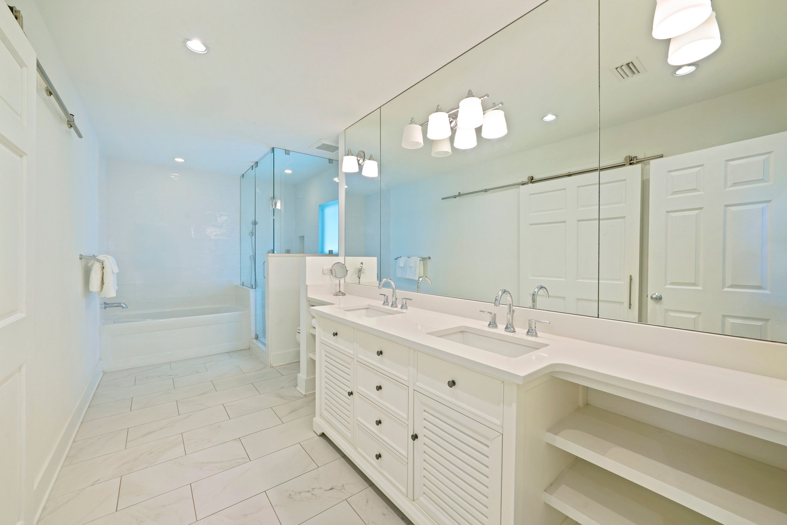EXPANSIVE BATHROOM SUITE; DUAL VANITIES, SOAKER TUB & SHOWER