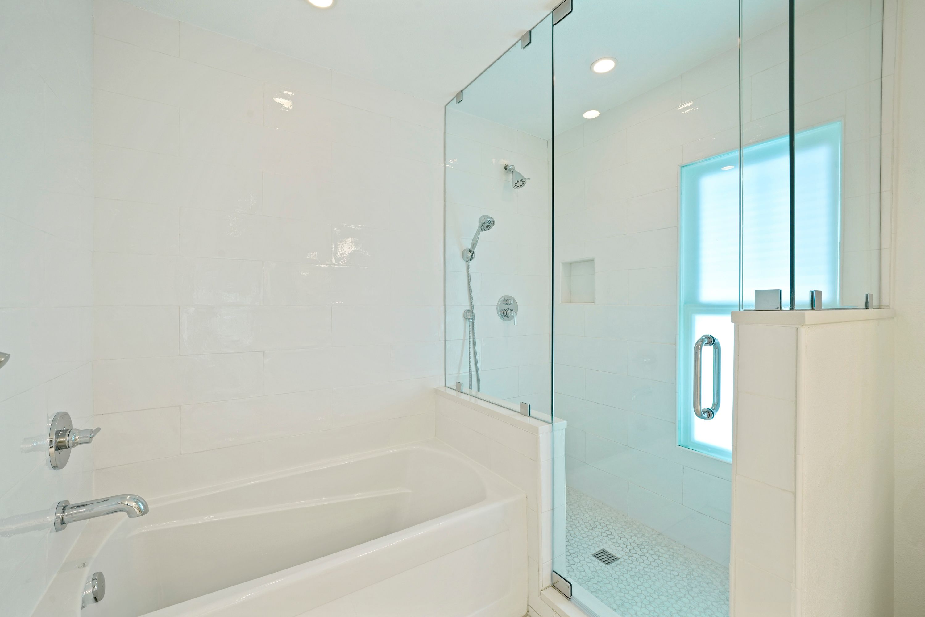 LARGE GLASS ENCLOSED WALK IN SHOWER & SOAKER TUB