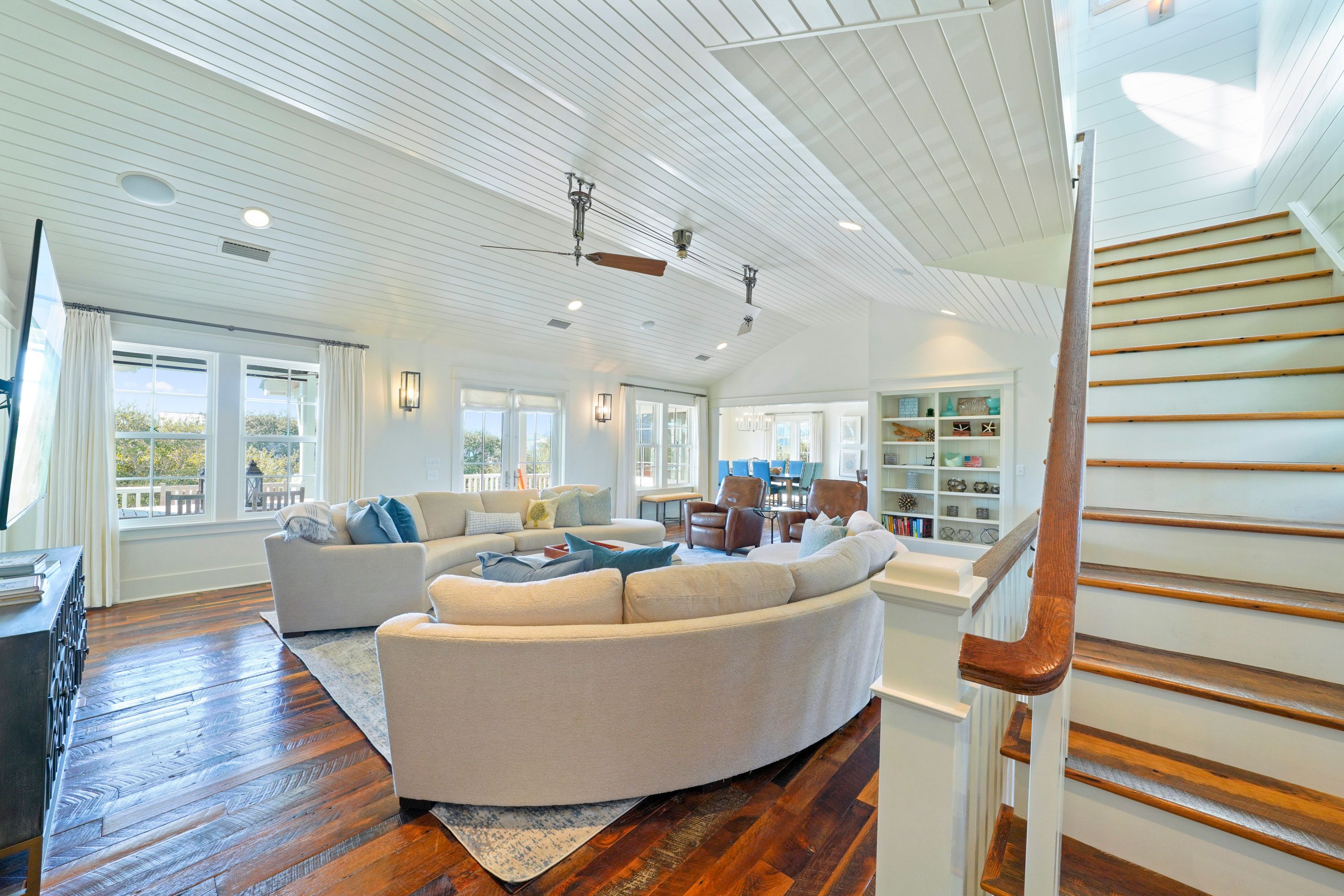 LIVING AREA WITH STAIRCASE TO THIRD FLOOR OPEN DECK W/GULF VIEWS
